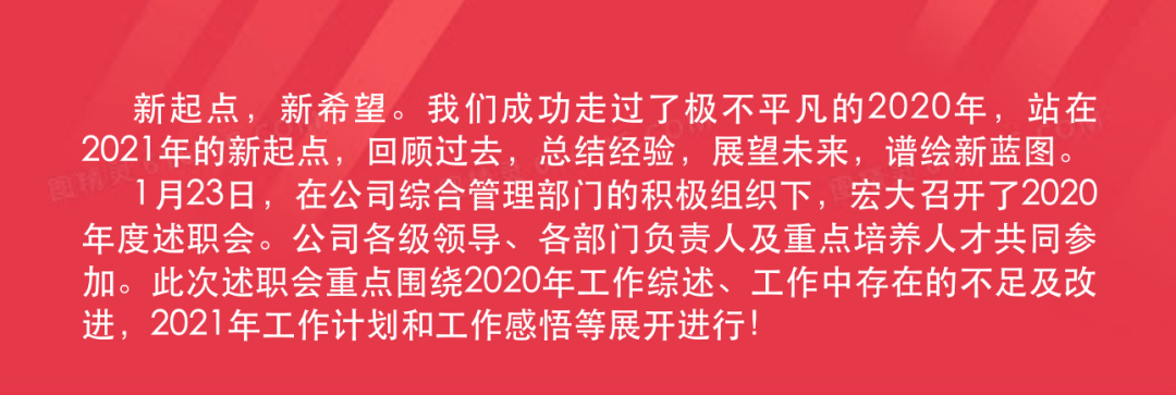 各部门述职结束后,董事长曾维楚对一天的述职进行总评及对2021年的规划和展望开展讲话。曾董说:“回顾2020年,全球疫情严峻,宏大在家人们的努力下平稳度过,很了不起,是我们宏大人共同努力的结果。推行事业部制及目标责任制,业绩增长明显,团队日趋成熟、成本有效管控、产品合格率显著提升,阿米巴经营也步入正轨,为2021及未来打下坚实基础。”