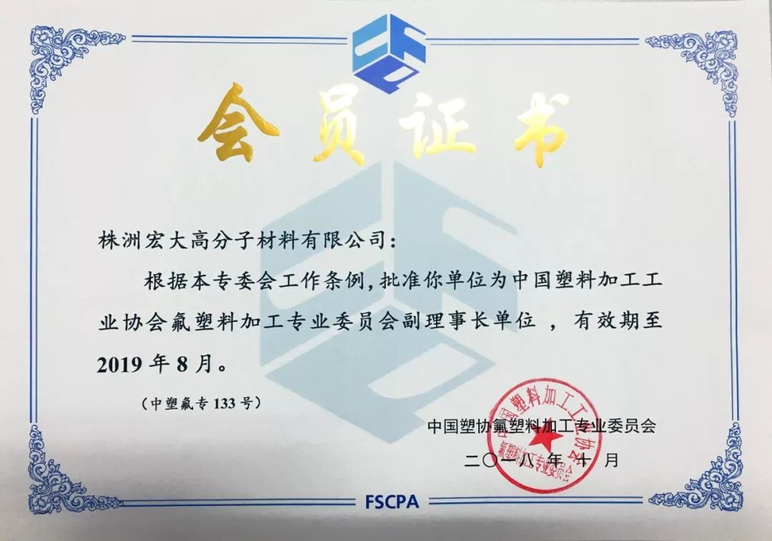 株洲宏大高分子材料有限公司新增为第五届理事会副理事长单位,获“中国氟塑料加工行业优秀创新型企业”荣誉称号,公司董事长曾维楚获“中国氟塑料加工行业优秀青年企业家”荣誉称号,公司环保装备事业部总经理尹武涛获“中国氟塑料加工行业先进个人”荣誉称号。