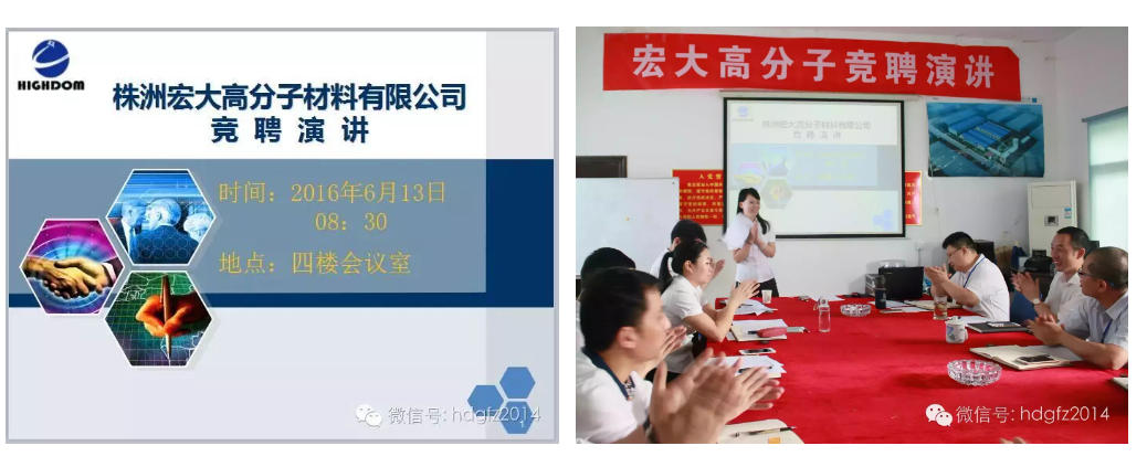 百舸争流,千帆竞发,宏大高分子开启了选人、用人、定岗、定员的新征程。通过组织架构的全面改革,2016年开始,公司积极构建能进能出、职务能上能下、待遇能高能低,优秀人才脱颖而出,充满生机活力的人事管理制度。6月13日,公司首次部长岗位竞聘演讲正式开讲,为公司中层干部队伍建设进行全面人才储备。
